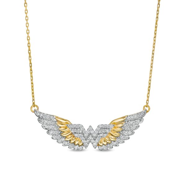 A striking style, this diamond necklace displays your confidence and strength. Created in warm 10K gold, this bold choice showcases the logo lined with sparkling diamonds. Highlighting the center, polished and diamond-adorned feathers shine in a layered wing design. Radiant with 1/4 ct. t.w. of diamonds and a brilliant buffed luster, this look suspends centered along a 16.5-inch cable chain that secures with a spring-ring clasp.This exclusive fine jewelry collection inspires you to wear your strength, confidence and power.