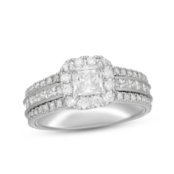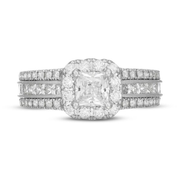This resplendent engagement ring showcases a glamorous 3/4-carat princess-cut diamond framed in brilliant round diamonds. Three rows of round diamonds shimmer down the band, complemented by classic milgrain accents for a sophisticated look. The ring is styled in iconic 14K white gold and has a total diamond weight of 2 1/8 carats.