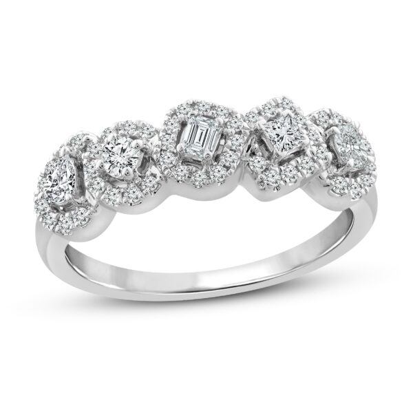 This striking diamond ring collection features five distinctively-shaped diamonds, symbolic of everything she means to you. Each diamond shape has a different meaning, from integrity and wisdom, to confidence, totality, and elegance. This gorgeous 10K white gold ring features a pear-shaped, round-cut, emerald-cut, princess-cut, and oval-cut diamond, each surrounded by a frame of sparkling round-cut diamonds. The ring has a total diamond weight of 1/2 carat.