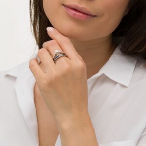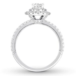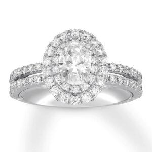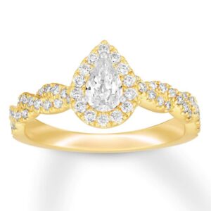 Collection comes this enchanting women’s engagement ring. The ring features a stunning pear-shaped diamond at its center, haloed by two rows of brilliant round diamonds. Additional round diamonds grace each side of the band, bringing the total diamond weight to 1 3/8 carats.The ring is fashioned in 14K white gold.