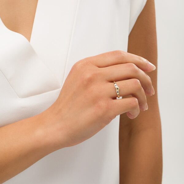 Crafted in warm 10K gold, this classic style is topped with a royal red star centered with a garnet. Bright blue sapphires set along the band add an eye-catching pop of color. Polished to a dazzling shine, this ring is a subtle reminder of your confidence and character.