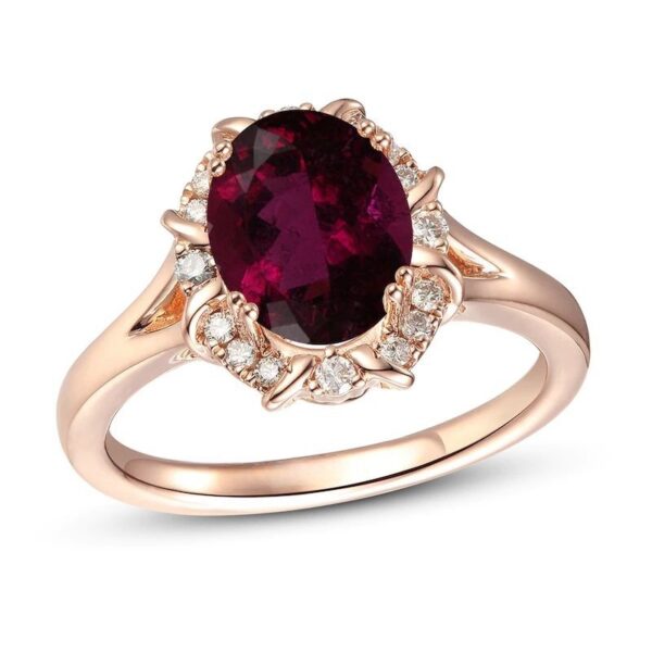 Please note: This ring is available in limited sizes. If you don’t see your size here, please visit a store to order your ring. Deep red hues of Raspberry Rhodolite garnet make this ring beautiful and eye-catching. Haloed by circling round Nude Diamonds, the 14K Strawberry Gold ring has a total diamond weight of 1/8 carat.