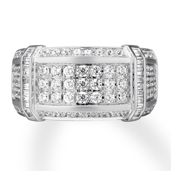 Three sparkling rows of round diamonds adorn the center of this distinguished men's band, while vertical rows of baguette diamonds provide contrasting brilliance. More diamonds edge the band to bring the total diamond weight to 1 1/2 carats. The ring is styled in high-polish 10K white gold.