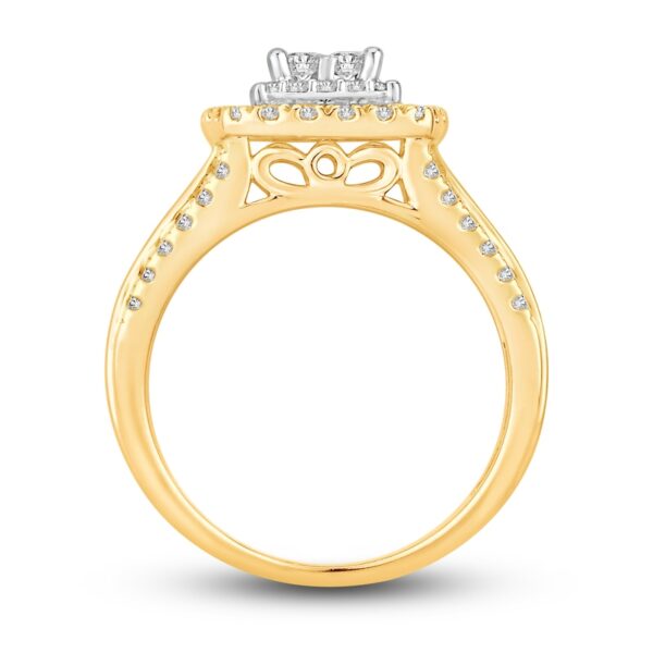 This gorgeous two-tone engagement ring showcases four stunning princess-cut diamonds at its center, set in iconic 14K white gold. Brilliant round diamonds halo the center diamonds, and another frame of round diamonds set in 14K yellow gold brings a beautiful contrast. The band sparkles with round and baguette-cut diamonds, giving the ring a total diamond weight of 1 carat.