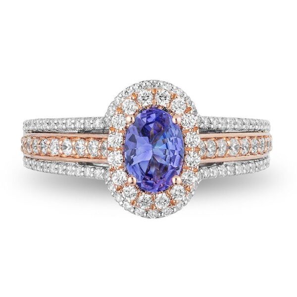 Drenched with vibrant colour, this gemstone and diamond engagement ring is an unforgettable look. Crafted in 14K two-toned gold, this bold design showcases a delectable 7.0 x 5.0mm oval-cut violet-blue tanzanite set in rose gold and wrapped in a sparkling diamond frame. A diamond-encrusted rose and white gold multi-row wrap-around the rose gold shell and white gold and diamond ribbons underneath. Small crown insets lower on the complete this magical choice. Sublime with 3/4 ct. t.w. of diamonds and a brilliant buffed luster, this engagement ring is a unique look of love.