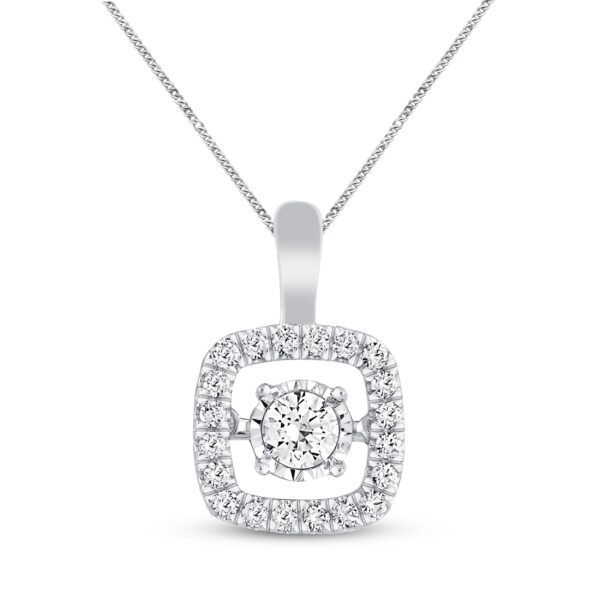 This stunning diamond necklace for her features a twinkling, square-shaped frame of round diamonds and a beautiful round diamond in the center that moves, catching light from every angle. The 10K white gold necklace shines with a total diamond weight of 1/2 carat. The pendant rests on a 19-inch curb chain that secures with a trigger clasp.